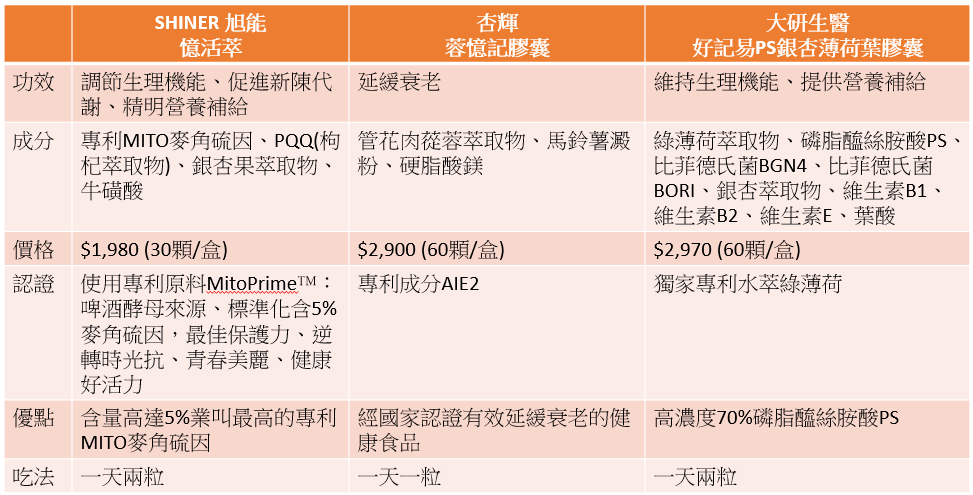 關於思緒清晰、精神飽滿我目前已使用過這三個品牌,並把三個品牌拿來做比較,分別是 【SHINER】憶活萃、【大研生醫】好記易、【杏輝】容憶記。我會針對訴求功效、成分、賣點、價格…等來做比較與分析